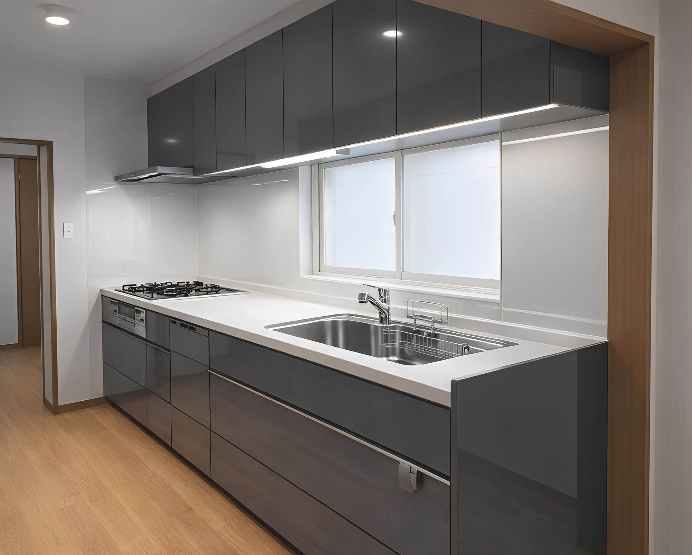 コンロ、シンク、作業スペースが横一列に並んだ、最も一般的でベーシックなスタイルです。
